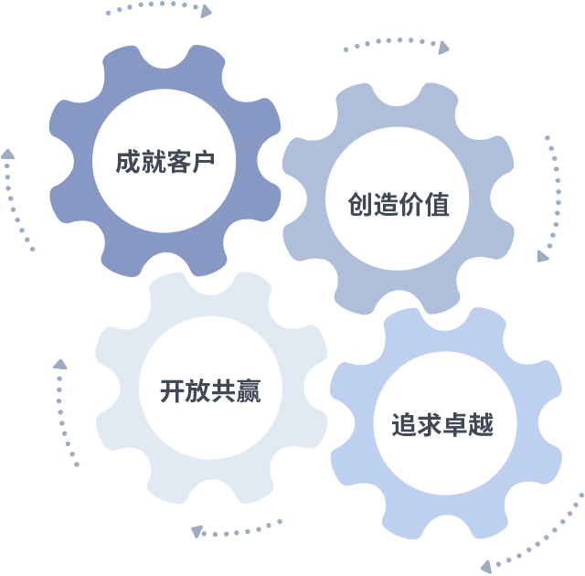 成就客户是一切决策的出发点,,创造价值是衡量所有工作的标准,,,追求卓越是我们做事做人的态度,,开放共赢是我们的格局也是最终的结果。。价值观的齿轮环环相扣,,推动着组织里的每个人不断向前。。。。