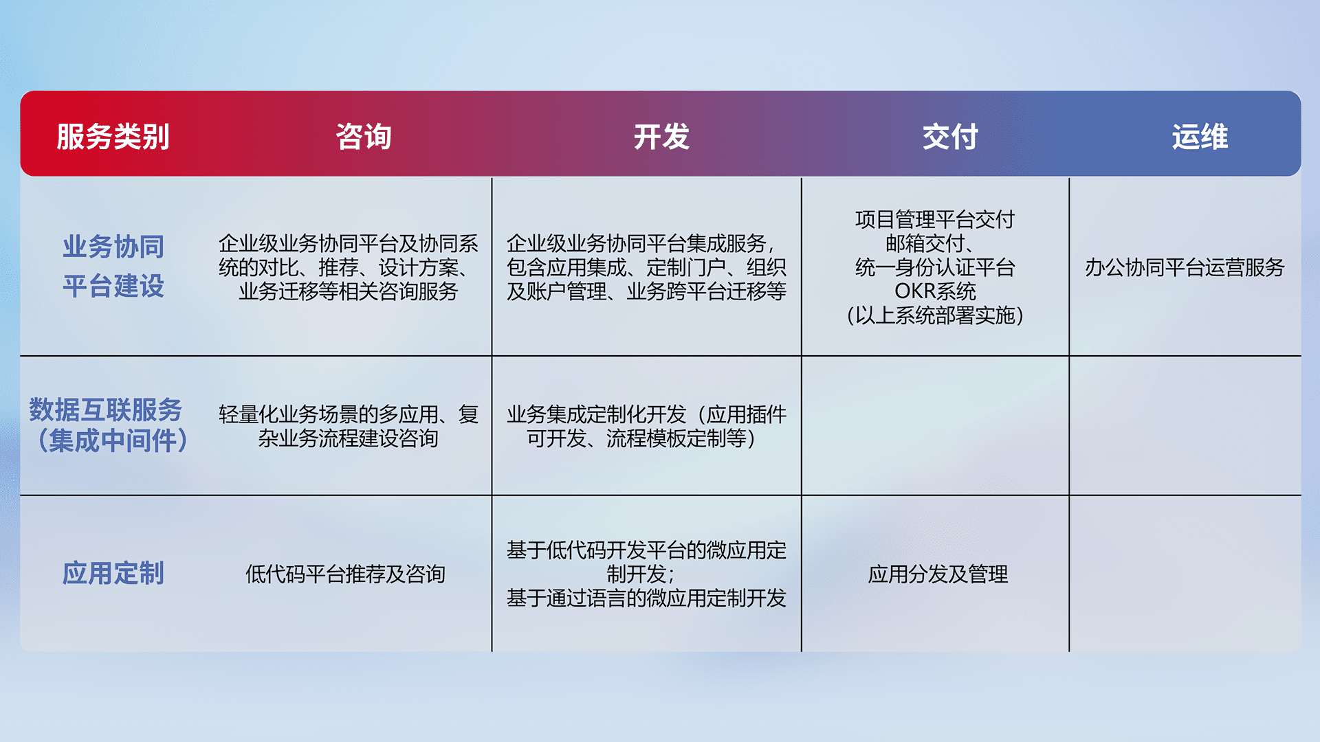 针对钉钉、、企微、、IDaas等平台级产品提供产品的规划、、方案、、、、交付、、、、定制化开发等服务,,实现如统一协同办公、、、、智能客户服务、、、混合会议管理、、、、智能数据查询、、、、等业务场景,,实现数字化转型。。