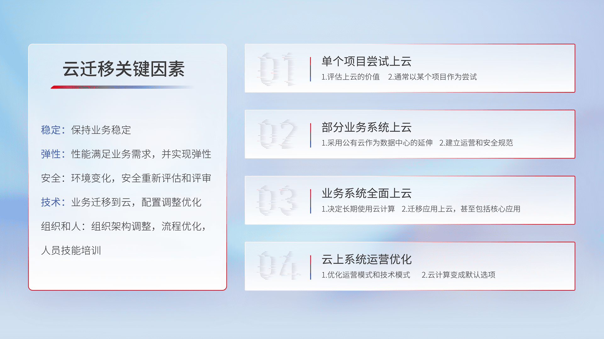 结合实际业务,,从规划设计、、云平台选型、、、、云原生改造、、、数据迁移、、、集成交付,,迁移全过程为客户识别最佳上云路径,,做好风险识别管理,,,,设计网络架构、、、、身份权限、、、安全审计合规、、操作审计、、、日志审计、、、监控告警策略、、、、多站点容灾设计等,,对云上基础设施进行整体规划,,,,提升IT治理水平,,以满足弹性、、、、高可用、、、、高性能的需求。。。。