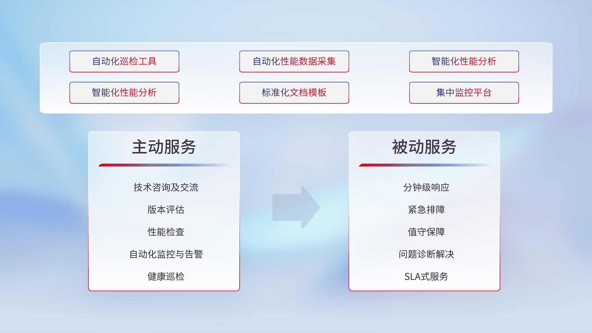 智能化工具和标准化文档,,,保障服务质量,,提供主动服务(包含技术咨询、、、版本评估、、、、性能检查、、自动化监控与告警、、、、健康巡检)和被动服务包含(分钟级响应、、、、紧急排障、、、、值守保障、、、、问题诊断解决、、、SLA服务)。。。